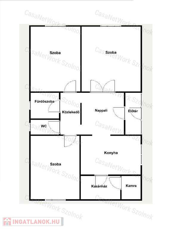 - rendelkezésre álló helyiségek: előtér, nappali, konyha, kamra, kazánház, 3 külön nyíló szoba, közlekedő, kádas fürdőszoba, illemhely